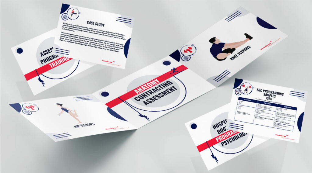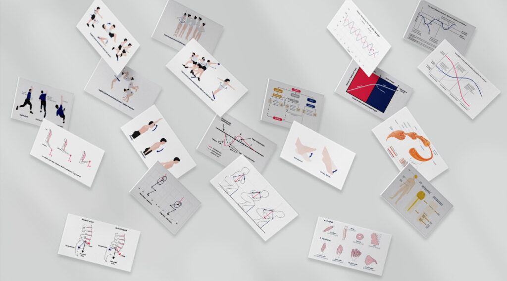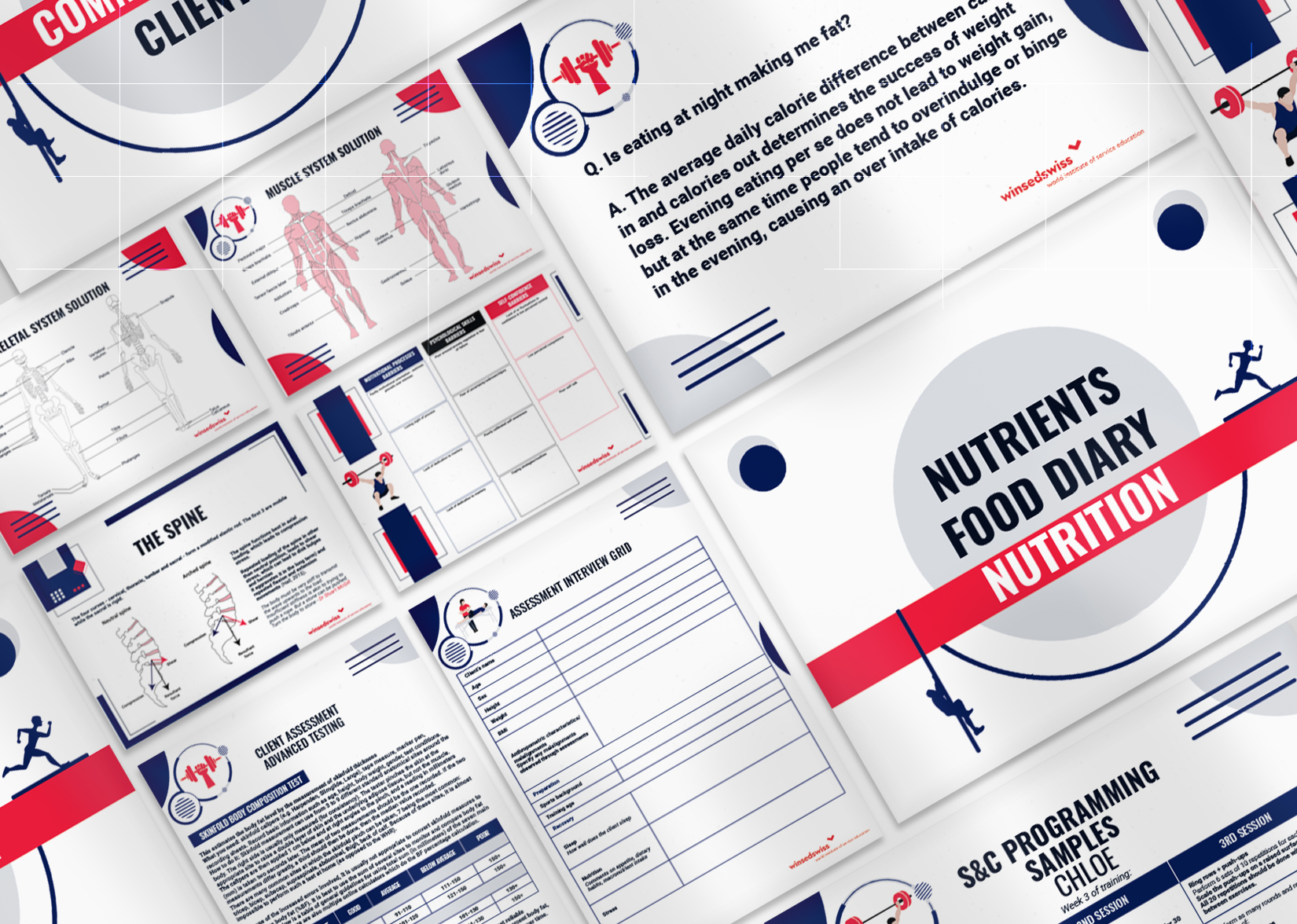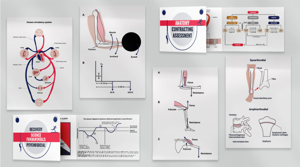 Having a pre-established curriculum (text-only) to include, we would need to make a series of icons, badges, graphs, tables and illustrations to accommodate the written information. The 3 courses mentioned would be focused on different subjects, so there was a need for immediate visual differentiation between the materials. Each course would have different deliverable needs, ranging from A4 & A5 files, to life-size anatomical posters; some would be text-oriented, others illustration-oriented. Visuals would need to align with the partner’s brand identity.