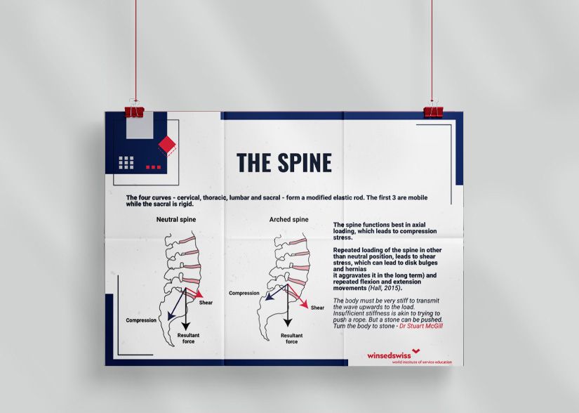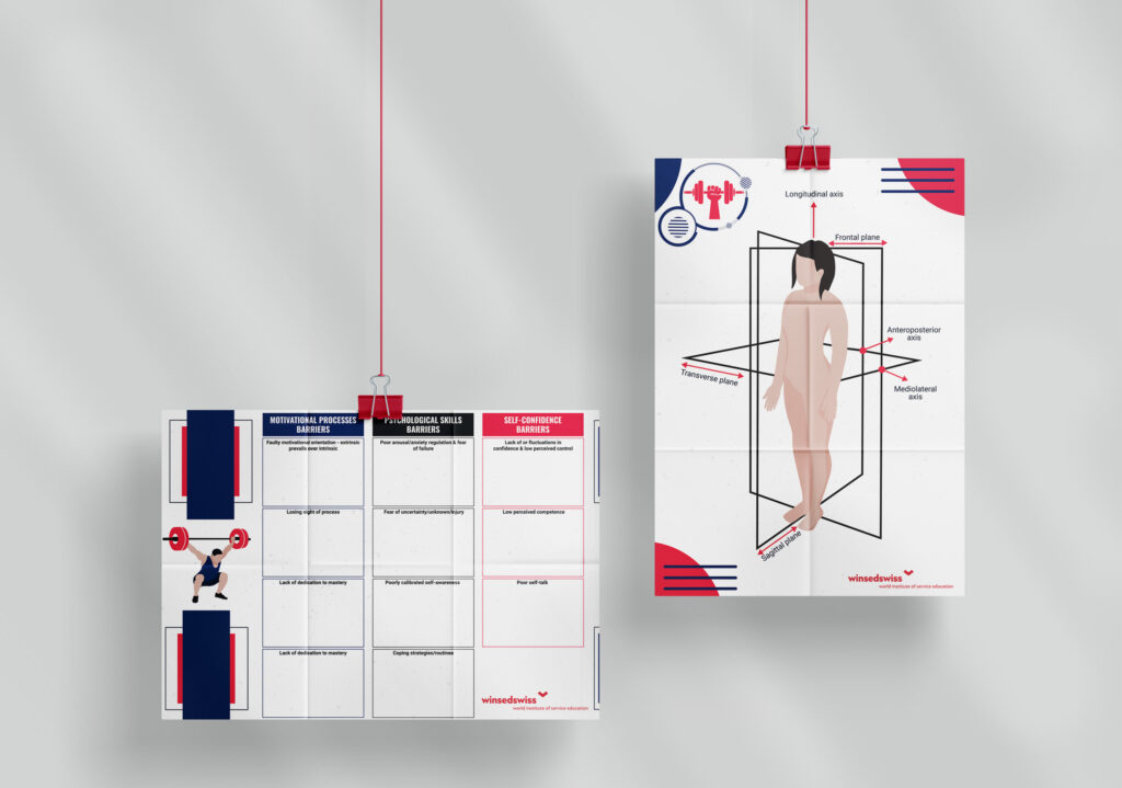 The posters were designed with both a theoretical and practical approach in mind. The former’s characteristics are that they highlight fitness 101 concepts and portray anatomical figures (human muscular and skeletal structure, the spine, tissue loadings). Meanwhile the latter’s characteristics are that they are meant to act as a physical support and be interactive and guide the students through their activities which can also require them to complete blank spaces or attach sticky notes directly on the posters.